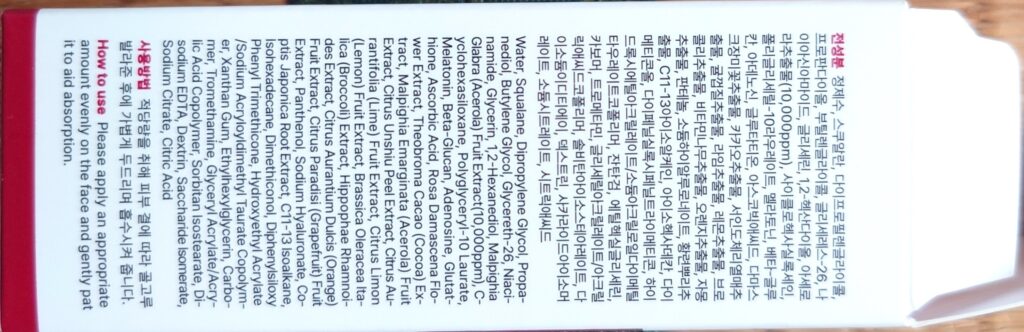 【전성분】정제수, 스쿠알란, 다이프로필렌글라이콜, 프로판다이올, 부틸렌글라이콜, 글리세레스-26, 나이아신아마이드, 글리세린, 1,2-헥산다이올, 아세로라추출물(10,000ppm), 사이클로헥사실록세인, 폴리글리세릴-10라우레이트, 멜라토닌, 베타-글루칸, 아데노신, 글루타티온, 아스코빅애씨드, 다마스크장미꽃추출물, 카카오추출물, 서인도체리열매추출물, 귤껍질추출물, 라임추출물, 레몬추출물, 브로콜리추출물, 비타민나무추출물, 오렌지추출물, 자몽추출물, 판테놀, 소듐하이알루로네이트, 황련뿌리추출물, C11-13아이소알케인, 아이소헥사데칸, 다이메티콘올, 다이페닐실록시페닐트라이메티콘, 하이드록시에틸아크릴레이트/소듐아크릴로일다이메틸타우레이트코폴리머, 잔탄검, 에틸헥실글리세린, 카보머, 트로메타민, 글리세릴아크릴레이트/아크릴릭애씨드코폴리머, 솔비탄아이소스테아레이트, 다이소듐이디티에이, 덱스트린, 사카라이드아이소머레이트, 소듐시트레이트, 시트릭애씨드