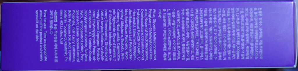 【全成分】水、グリセリン(保湿/溶剤/保水)、メチルプロパンジオール(溶剤/皮膚柔軟化)、ジステアリン酸ポリグリセリル-3メチルグルコース(エモリエント/乳化)、ジヘプタン酸ネオペンチルグリコール(増粘/エモリエント)、シクロヘキサシロキサン(基剤/溶剤)、セテアリルアルコール(乳化安定/感触改良)、水添ポリ(C6-14オレフィン)(増粘)、1,2-ヘキサンジオール(溶剤/防腐補助)、バクチオール1,000ppm(コラーゲン・ヒアルロン酸生成促進/抗炎症/ターンオーバー促進/肌バリア機能修復/メラニン生成抑制/メラニン排泄促進/抗菌)、アロエベラ葉多糖体(抗炎症/抗菌/保水/皮膜形成/エモリエント)、β-グルカン(コラーゲン生成促進)、パンテノール(抗炎症/コラーゲン生成促進/ターンオーバー促進/肌バリア機能修復/皮脂分泌調整/細胞賦活による浸透促進)、ヒドロキシデシルユビキノン(活性酸素除去/細胞賦活/肌バリア機能修復/メラニン生成抑制/色素沈着抑制)、ビサボロール(抗炎症/コラーゲン生成促進/活性酸素除去/メラニン生成抑制/刺激緩和/抗菌)、β-カロチン(着色)、ナイアシンアミド(コラーゲン生成促進/肌バリア機能修復/細胞賦活/色素沈着抑制)、トリ(カプリル酸/カプリン酸)グリセリル(基剤/溶剤)、ステアリン酸グリセリル(乳化)、(C11-13)イソパラフィン(溶剤)、イソヘキサデカン(エモリエント)、カルボマー(乳化安定/増粘)、トロメタミン(pH調整)、ジメチコノール(基剤/エモリエント/消泡)、(アクリル酸Na/アクリロイルジメチルタウリンNa)コポリマー(乳化/増粘/分散/感触改良)、ポリイソブテン(皮膜形成/増粘/光沢)、エチルヘキシルグリセリン(防腐補助/消臭)、プロパンジオール(保湿/防腐補助/溶剤)、EDTA-2Na (キレート)、オレイン酸ソルビタン(乳化/賦香)、(カプリリル/カプリル)グルコシド(可溶化)、BG(保湿/防腐補助/溶剤)、水添レシチン(乳化/刺激緩和/分散/リポソーム持続性向上)、ラウリン酸ポリグリセリル-10(乳化/可溶化)、アスコルビルリン酸Na(コラーゲン生成促進/皮脂分泌調整/UV刺激抑制)、ラウリルカルバミン酸イヌリン(乳化/乳化安定/分散)、ビオチン(抗炎症/ターンオーバー促進)、ピリドキシン(抗炎症/皮脂分泌調整/細胞賦活)、葉酸(ターンオーバー促進)、シアノコバラミン(抗炎症/着色)、トコフェロール(酸化防止)、リボフラビン(抗炎症/ターンオーバー促進/皮脂分泌調整)、チアミンHCL(抗炎症/ターンオーバー促進/肌バリア機能修復/皮脂分泌調整)、リノール酸(エモリエント/メラニン生成抑制/色素沈着抑制/加脂肪/洗浄/賦香)