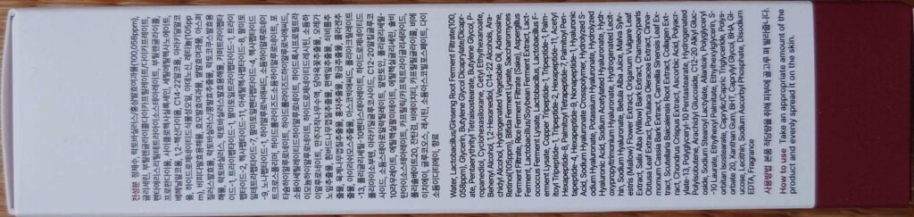 【Indredients】Water, Lactobacillus/Ginseng Root Ferment Filtrate(100,058ppm), Glycerin, Butylene Glycol Dicaprylate/Dicaprate, Pentaerythrityl Tetraisostearate, Butylene Glycol, Propanediol, Cyclohexasiloxane, Cetyl Ethylhexanoate, Behenyl Alcohol, 1,2-Hexanediol, C14-22 Alcohols, Arachidyl Alcohol, Hydrogenated Vegetable Oil, Adenosine, Retinol (105ppm), Bifida Ferment Lysate, Saccharomyces Ferment Filtrate, Rice Ferment Filtrate (Sake), Aspergillus Ferment, Lactobacillus/Soybean Ferment Extract, Lactococcus Ferment Lysate, Lactobacillus, Lactobacillus Ferment Lysate, Copper Tripeptide-1, Tripeptide-1, Palmitoyl Tripeptide-1, Tripeptide-2, Hexapeptide-11, Acetyl Hexapeptide-8, Palmitoyl Tetrapeptide-7, Palmitoyl Pentapeptide-4, Hexapeptide-9, Nonapeptide-1, Hyaluronic Acid, Sodium Hyaluronate Crosspolymer, Hydrolyzed Sodium Hyaluronate, Potassium Hyaluronate, Hydrolyzed Hyaluronic Acid, Sodium Acetylated Hyaluronate, Hydroxypropyltrimonium Hyaluronate, Hydrogenated Lecithin, Sodium Hyaluronate, Betula Alba Juice, Malva Sylvestris (Mallow) Flower Extract, Origanum Vulgare Leaf Extract, Salix Alba (Willow) Bark Extract, Chamaecyparis Obtusa Leaf Extract, Portulaca Oleracea Extract, Cinnamomum Cassia Bark Extract, Camellia Sinensis Leaf Extract, Scutellaria Baicalensis Root Extract, Collagen Extract, Chondrus Crispus Extract, Ascorbic Acid, Polyacrylate-13, Polyglyceryl-10 Pentastearate, Hydrogenated Polyisobutene, Arachidyl Glucoside, C12-20 Alkyl Glucoside, Sodium Stearoyl Lactylate, Allantoin, Polyglyceryl-10 Laurate, Ethylhexyl Palmitate, Ethylhexylglycerin, Sorbitan Isostearate, Caprylic/Capric Triglyceride, Polysorbate 20, Xanthan Gum, BHT, Caprylyl Glycol, BHA, GIucose, Lecithin, Sodium Ascorbyl Phosphate, Disodium EDTA, Fragrance