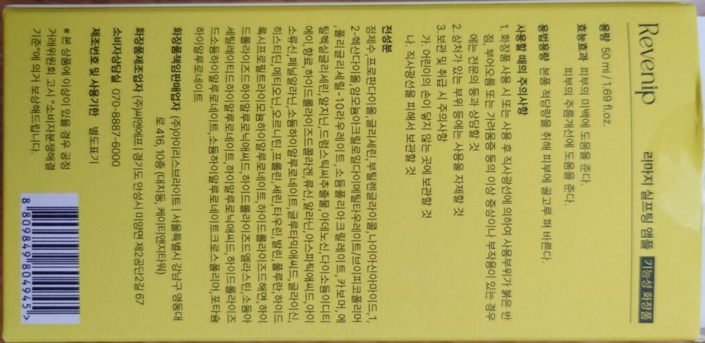 【전성분】정제수, 프로판다이올, 글리세린, 부틸렌글라이콜, 나이아신아마이드, 1,2-헥산다이올, 암모늄아크릴로일다이메틸타우레이트/브이피코폴리머, 폴리글리세릴-10라우레이트, 소듐폴리아크릴레이트, 카보머, 에틸헥실글리세린, 알지닌, 드럼스틱씨추출물, 아데노신, 다이소듐이디티에이, 향료, 하이드롤라이즈드콜라겐, 류신, 알라닌, 아스파틱애씨드, 아이소류신, 페닐알라닌, 소듐하이알루로네이트, 글루타믹애씨드, 글라이신, 히스티딘, 메티오닌, 오르니틴, 프롤린, 세린, 타우린, 발린, 풀루란, 하이드록시프로필트라이모늄하이알루로네이트, 하이드롤라이즈드해면, 하이드롤라이즈드하이알루로닉애씨드, 하이드롤라이즈드엘라스틴, 소듐아세틸레이티드하이알루로네이트, 하이알루로닉애씨드, 하이드롤라이즈드소듐하이알루로네이트, 소듐하이알루로네이트크로스폴리머, 포타슘하이알루로네이트