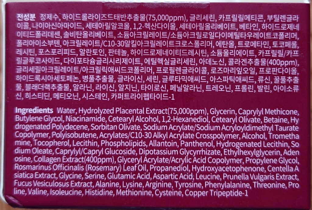 【전성분】정제수, 하이드롤라이즈드태반추출물(75,000ppm), 글리세린, 카프릴릴메티콘, 부틸렌글라이콜, 나이아신아마이드, 세테아릴알코올, 1,2-헥산다이올, 세테아릴올리베이트, 베타인, 하이드로제네이티드폴리데센, 솔비탄올리베이트, 소듐아크릴레이트/소듐아크릴로일다이메틸타우레이트코폴리머, 폴리아이소부텐, 아크릴레이트/C10-30알킬아크릴레이트크로스폴리머, 에탄올, 트로메타민, 토코페롤, 레시틴, 포스포리피드, 알란토인, 판테놀, 하이드로제네이티드레시틴, 소듐올리에이트, 카프릴릴/카프릴글루코사이드, 다이포타슘글리시리제이트, 에틸헥실글리세린, 아데노신, 콜라겐추출물(400ppm), 글리세릴아크릴레이트/아크릴릭애씨드코폴리머, 프로필렌글라이콜, 로즈마리잎오일, 프로판다이올, 하이드록시아세토페논, 병풀추출물, 글라이신, 세린, 글루타믹애씨드, 아스파틱애씨드, 류신, 꿀풀추출물, 블래더랙추출물, 알라닌, 라이신, 알지닌, 타이로신, 페닐알라닌, 트레오닌, 프롤린, 발린, 아이소류신, 히스티딘, 메티오닌, 시스테인, 카퍼트라이펩타이드-1