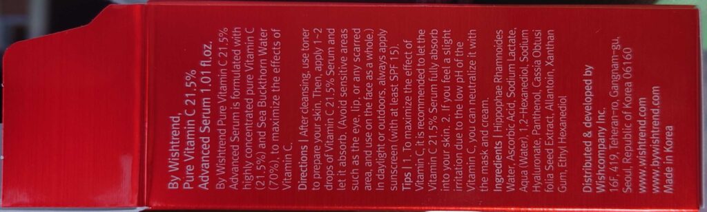 【전성분】비타민나무수, 아스코빅애씨드, 소듐락테이트, 정제수, 1,2-헥산다이올, 소듐하이알루로네이트, 판테놀, 결명씨추출물, 알란토인, 잔탄검, 에틸헥산다이올