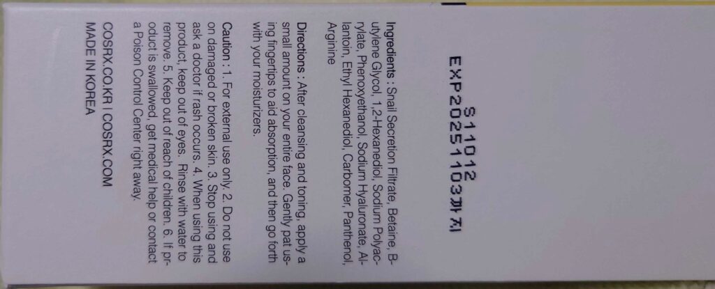 【Ingredients】Snail Secretion Filtrate, Betaine, Butylene Glycol, 1,2-Hexanediol, Sodium Polyacrylate, Phenoxyethanol, Sodium Hyaluronate, Allantoin, Ethyl Hexanediol, Carbomer, Panthenol, Arginine
