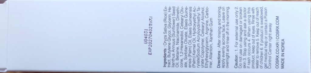【전성분】쌀추출물, 부틸렌글라이콜, 글리세린, 해바라기씨오일, 베타인, 나이아신아마이드, 다이메티콘, 1,2-헥산다이올, 세테아릴올리베이트, 솔비탄올리베이트, 오일팜오일, 오일팜커넬오일, 하이드록시에틸아크릴레이트/소듐아크릴로일다이메틸타우레이트코폴리머, 세테아릴알코올, 에틸헥실글리세린, 알지닌, 카보머, 알란토인, 잔탄검