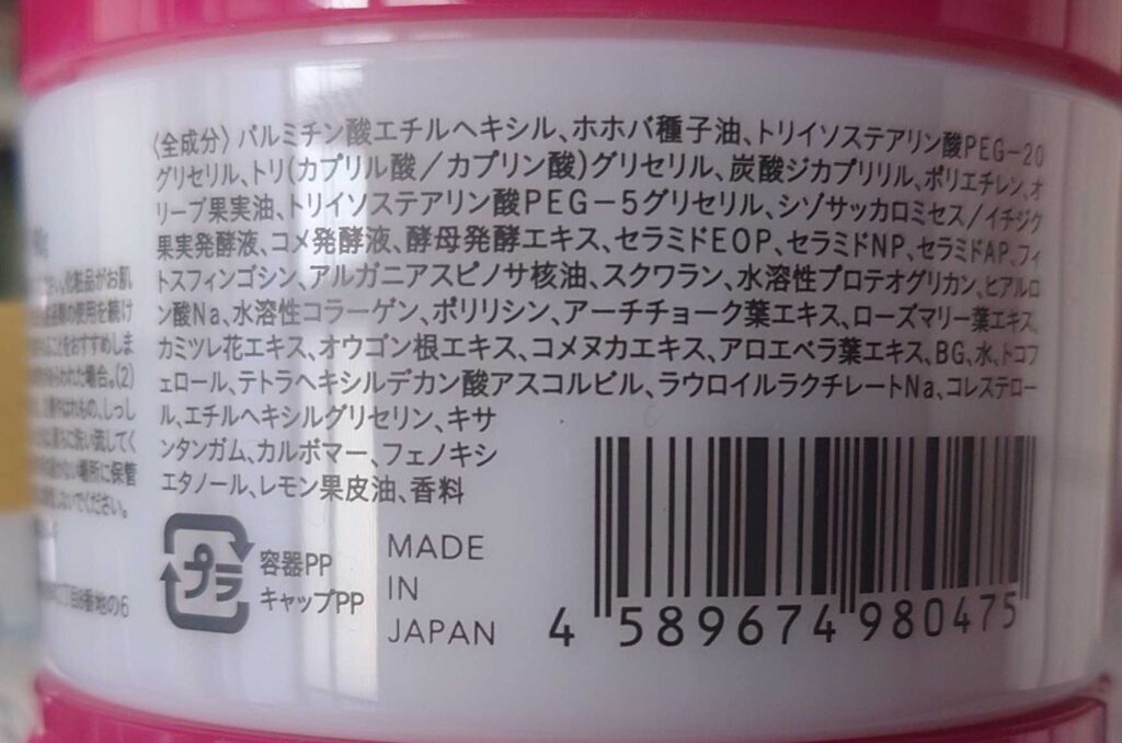 【全成分】パルミチン酸エチルヘキシル (基剤)、ホホバ種子油(基剤/エモリエント/溶剤)、トリイソステアリン酸PEG-20グリセリル(乳化/エモリエント)、トリ(カプリル酸/カプリン酸)グリセリル(基剤/溶剤)、炭酸ジカプリリル(基剤/溶剤/エモリエント)、ポリエチレン(スクラブ/乳化安定/固化・増粘/感触改良)、オリーブ果実油(基剤/エモリエント/溶剤/賦香)、トリイソステアリン酸PEG-5グリセリル(乳化/エモリエント)、シゾサッカロミセス/イチジク果実発酵液(ヒアルロン酸生成促進)、コメ発酵液(肌バリア機能修復/血行促進/細胞賦活/コラーゲン生成促進/メラニン生成抑制/角質剝離)、酵母発酵エキス(細胞賦活/ターンオーバー促進)、セラミドEOP(肌バリア機能修復)、セラミドNP(肌バリア機能修復)、セラミドAP(肌バリア機能修復)、フィトスフィンゴシン(抗炎症/肌バリア機能修復/抗アクネ菌/抗菌)、アルガニアスピノサ核油(エモリエント)、スクワラン(基剤/溶剤)、水溶性プロテオグリカン(保湿)、ヒアルロン酸Na(保湿)、水溶性コラーゲン(保湿/感触改良)、ポリリシン(皮膜形成/消臭)、アーチチョーク葉エキス(メラニン生成抑制/色素沈着抑制/抗光老化)、ローズマリー葉エキス(活性酸素除去/収れん/抗酸・抗光老化)、カミツレ花エキス(抗炎症/UVB吸収/抗アレルギー/賦香)、オウゴン根エキス(抗炎症/メラニン生成抑制/UVB吸収/収れん/抗菌)、コメヌカエキス(角層水分量増加/活性酸素生成抑制/キレート)、アロエベラ葉エキス(角層水分量増加/保湿/エモリエント)、BG(保湿/防腐補助/溶剤)、水、トコフェロール(酸化防止)、テトラヘキシルデカン酸アスコルビル(抗炎症/コラーゲン生成促進/皮脂分泌調整/エモリエント)、ラウロイルラクチレートNa(乳化/起泡)、コレステロール(増粘/乳化・リポソーム安定/エモリエント)、エチルヘキシルグリセリン(防腐補助/消臭)、キサンタンガム(増粘)、カルボマー(乳化安定/増粘)、フェノキシエタノール(防腐)、レモン果皮油(ターンオーバー促進/血行促進/皮膚柔軟化/皮脂分泌調整/抗菌/賦香)、香料(賦香)