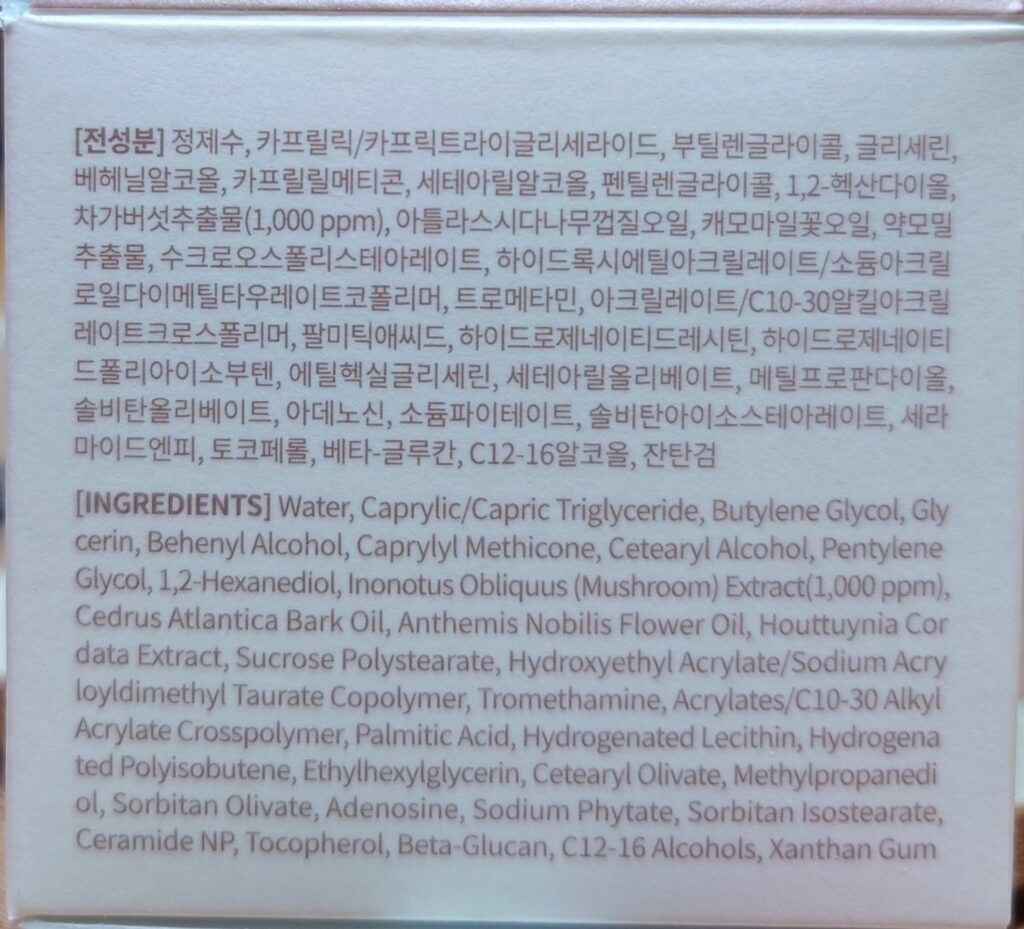【전성분】정제수, 카프릴릭/카프릭트라이글리세라이드, 부틸렌글라이콜, 글리세린, 베헤닐알코올, 카프릴릴메티콘, 세테아릴알코올, 펜틸렌글라이콜, 1,2-헥산다이올, 차가버섯추출물(1,000ppm), 아틀라스시다나무껍질오일, 캐모마일꽃오일, 약모밀추출물, 수크로오스폴리스테아레이트, 하이드록시에틸아크릴레이트/소듐아크릴로일다이메틸타우레이트코폴리머, 트로메타민, 아크릴레이트/C10-30알킬아크릴레이트크로스폴리머, 팔미틱애씨드, 하이드로제네이티드레시틴, 하이드로제네이티드폴리아이소부텐, 에틸헥실글리세린, 세테아릴올리베이트, 메틸프로판다이올, 솔비탄올리베이트, 아데노신, 소듐파이테이트, 솔비탄아이소스테아레이트, 세라마이드엔피, 토코페롤, 베타-글루칸, C12-16알코올, 잔탄검