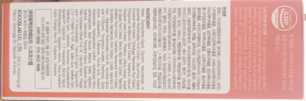 【전성분】정제수, 다이프로필렌글라이콜, 글리세린, 나이아신아마이드, 비타민나무열매추출물, 스페인감초뿌리추출물, 라케모사승마뿌리추출물, 하수오뿌리추출물, 검은깨추출물, 진흙버섯추출물, 참당귀뿌리추출물, 뽕나무껍질추출물, 작약뿌리추출물, 고삼뿌리추출물, 황금추출물, 황련추출물, 비타민나무열매오일, 아스코빌글루코사이드(100ppm), 토코페릴아세테이트, 판테놀, 글루타티온, 아스타잔틴, 풀러린, 페룰릭애씨드, 소듐하이알루로네이트, 하이드로제네이티드레시틴, 하이드롤라이즈드글라이코사미노글리칸, 베타-글루칸, 베타인, 자일리톨, 알란토인, 알지닌, 아데노신, 펜틸렌글라이콜, 부틸렌글라이콜, 올리브오일, 카프릴릴글라이콜, 폴리글리세릴-10다이아이소스테아레이트, 카프릴릭/카프릭트라이글리세라이드, C12-13파레스-9, 피브이피, 아가, 젤란검, 잔탄검, 스클레로튬검, 카보머, 암모늄아크릴로일다이메틸타우레이트/브이피코폴리머, 1,2-헥산다이올, 벤질글라이콜, 에틸헥실글리세린, 라즈베리케톤, 오렌지껍질오일, 향료, 리모넨