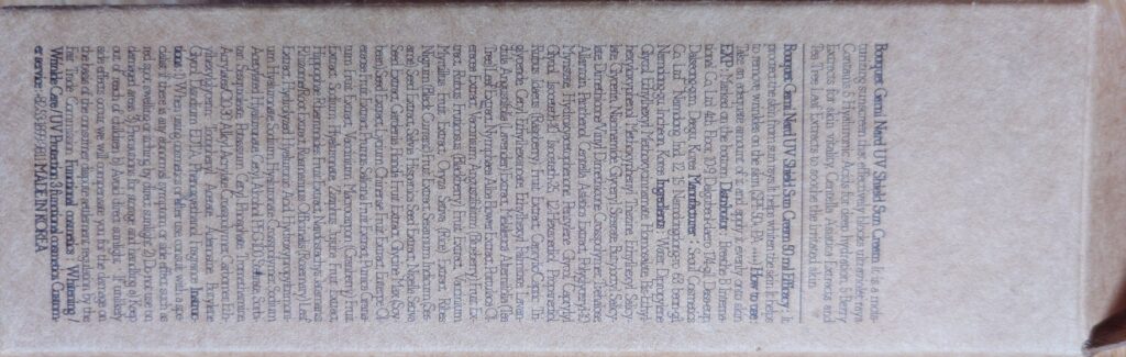 【全成分】水、DPG(溶剤/保湿/防腐補助/減粘)、メトキシケイヒ酸エチルヘキシル(UVB吸収/退色防止)、ホモサレート(UVB吸収)、ビスエチルヘキシルオキシフェノールメトキシフェニルトリアジン(UVB・UVA吸収/光安定化)、サリチル酸エチルヘキシル(UVB吸収/退色防止)、グリセリン(保湿/溶剤/保水)、ナイアシンアミド(コラーゲン生成促進/肌バリア機能修復/細胞賦活/色素沈着抑制)、ステアリン酸グリセリル(乳化/エモリエント)、サリチル酸ブチルオクチル(光安定化/分散/保湿)、(ジメチコン/ビニルジメチコン)クロスポリマー(増粘/感触改良/ソフトフォーカス)、トレハロース(保水/消臭)、アラントイン(抗炎症/細胞賦活/ターンオーバー促進/肌バリア機能修復/刺激緩和)、パンテノール(抗炎症/コラーゲン生成促進/ターンオーバー促進/肌バリア機能修復/皮脂分泌調整/細胞賦活による浸透促進)、ツボクサエキス(抗炎症/コラーゲン生成促進/細胞賦活/色素沈着抑制)、ミリスチン酸ポリグリセリル-10(乳化)、ヒドロキシアセトフェノン(抗炎症/防腐補助/乳化安定)、ペンチレングリコール(防腐補助/溶剤)、カプリリルグリコール(防腐補助)、イソセテス-10(乳化)、イソセテス-25(乳化)、1,2-ヘキサンジオール(溶剤/防腐補助/静菌)、プロパンジオール(保湿/防腐補助/溶剤)、ヨーロッパキイチゴ果実エキス(抗炎症/血行促進/活性酸素生成抑制/メラニン生成抑制/皮脂分泌調整/色素沈着抑制/抗アレルギー)、トリ(カプリル酸/カプリン酸)グリセリル(基剤/溶剤)、エチルヘキサン酸セチル(基剤/エモリエント)、パルミチン酸エチルヘキシル(基剤)、ラベンダーエキス(抗炎症/細胞賦活/皮脂分泌調整/抗菌)、ティーツリー葉エキス(皮脂分泌調整/抗菌)、ニンファエアアルバ花エキス(抗炎症/メラニン生成抑制/色素沈着抑制/皮脂分泌調整/清涼)、スベリヒユエキス(抗炎症/刺激緩和/抗菌)、ローブッシュブルーベリー果実エキス(コラーゲン生成促進/メラニン生成抑制/UV刺激抑制/活性酸素生成抑制/皮脂分泌調整)、セイヨウヤブイチゴ果実エキス(抗炎症/コラーゲン生成促進/活性酸素生成抑制/メラニン生成抑制/皮脂分泌調整/抗菌/賦香)、ビルベリー果実エキス(抗炎症/血行促進)、コメエキス(細胞賦活/エモリエント)、クロフサスグリ果実エキス(抗炎症/血行促進/抗アレルギー/エモリエント)、ゴマ種子エキス(活性酸素除去/UV刺激抑制)、サルビアヒスパニカ種子エキス(抗炎症/血行促進/活性酸素除去)、ニゲラサチバ種子エキス(抗炎症/肌バリア機能修復/皮脂分泌調整)、クチナシ果実エキス(抗炎症)、ダイズ種子エキス(コラーゲン生成促進/皮脂分泌調整/色素沈着抑制)、クコ果実エキス(コラーゲン生成促進/血行促進/肌バリア機能修復/活性酸素除去)、アサイヤシ果実エキス(メラニン生成抑制/活性酸素除去/抗アクネ菌)、スモモ果実エキス(酸化防止)、ザクロ果実エキス(抗炎症/血行促進/色素沈着抑制/ターンオーバー促進/皮脂分泌調整)、クランベリー果実エキス(コラーゲン生成促進/抗炎症/血行促進/肌バリア機能修復/抗菌)、ヒアルロン酸Na(保湿)、ナツメ果実エキス(細胞賦活/ターンオーバー促進)、ヒポファエラムノイデス果実エキス(抗炎症/ヒアルロン酸生成促進/メラニン生成抑制)、ナルドスタチスジャタマンシ根茎/根エキス91.95ppm(???)、ローズマリー葉エキス(活性酸素除去/皮脂分泌調整/酸化防止)、加水分解ヒアルロン酸(保湿)、ヒアルロン酸ヒドロキシプロピルトリモニウム(保湿)、ヒアルロン酸クロスポリマーNa(保湿)、アセチルヒアルロン酸Na(保湿)、セタノール(乳化安定/感触改良)、ステアリン酸PEG-100(乳化)、セスキオレイン酸ソルビタン(乳化)、セチルリン酸K(乳化)、トロメタミン(中和/pH調整)、(アクリレーツ/アクリル酸アルキル(C10-30))クロスポリマー(乳化)、カルボマー(増粘/乳化安定)、エチルヘキシルグリセリン(防腐補助/消臭)、酢酸トコフェロール(血行促進/酸化防止)、アデノシン(コラーゲン生成促進)、BG(保湿/防腐補助/溶剤)、EDTA-2Na(キレート)、フェノキシエタノール(防腐)、香料(賦香)