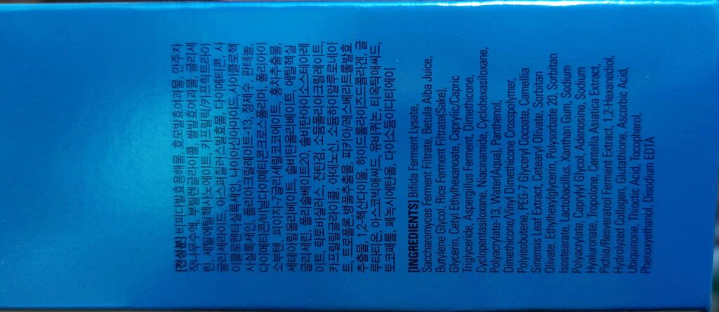 【INGREDIENTS】Bifida Ferment Lysate, Saccharomyces Ferment Filtrate, Betula Alba Juice, Butylene Glycol, Rice Ferment Filtrate(Sake), Glycerin, Cetyl Ethylhexanoate, Caprylic/Capric Triglyceride, Aspergillus Ferment, Dimethicone, Cyclopentasiloxane, Niacinamide, Cyclohexasiloxane, Polyacrylate-13, Water(Aqua), Panthenol, Dimethicone/Vinyl Dimethicone Crosspolymer, Polyisobutene, PEG-7 Glyceryl Cocoate, Camellia Sinensis Leaf Extract, Cetearyl Olivate, Sorbitan Olivate, Ethylhexylglycerin, Polysorbate 20, Sorbitan Isostearate, Lactobacillus, Xanthan Gum, Sodium Polyacrylate, Caprylyl Glycol, Adenosine, Sodium Hyaluronate, Tropolone, Centella Asiatica Extract, Pichia/Resveratrol Ferment Extract, 1,2-Hexanediol, Hydrolyzed Collagen, Glutathione, Ascorbic Acid, Ubiquinone, Thioctic Acid, Tocopherol, Phenoxyethanol, Disodium EDTA