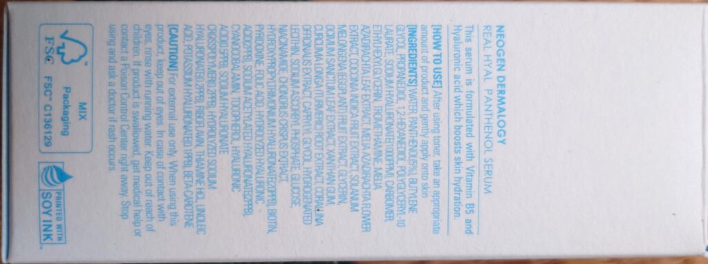【INGREDIENTS】Water, Panthenol(5%), Butylene Glycol, Propanediol, 1,2-Hexanediol, Polyglyceryl-10 Laurate, Sodium Hyaluronate(1000ppm), Carbomer, Ethylhexylglycerin, Tromethamine, Melia Azadirachta Leaf Extract, Melia Azadirachta Flower Extract, Coccinia Indica Fruit Extract, Solanum Melongena (Eggplant) Fruit Extract, Glycerin, Ocimum Sanctum Leaf Extract, Xanthan Gum, Curcuma Longa (Turmeric) Root Extract, Corallina Officinalis Extract, Caprylyl Glycol, Hydrogenated Lecithin, Sodium Ascorbyl Phosphate, Glucose, Niacinamide, Chondrus Crispus Extract, Hydroxypropyltrimonium Hyaluronate(20ppb), Biotin, Pyridoxine, Folic Acid, Hydrolyzed Hyaluronic Acid(2ppb), Sodium Acetylated Hyaluronate(2ppb), Cyanocobalamin, Tocopherol, hyaluronic acid(0.5ppb), Sodium Hyaluronate Crosspolymer(0.2ppb), Hydrolyzed Sodium Hyaluronate(0.2ppb), Riboflavin, Thiamine HCl, Linoleic Acid, Potassium Hyaluronate(0.1ppb), Beta-Carotene
